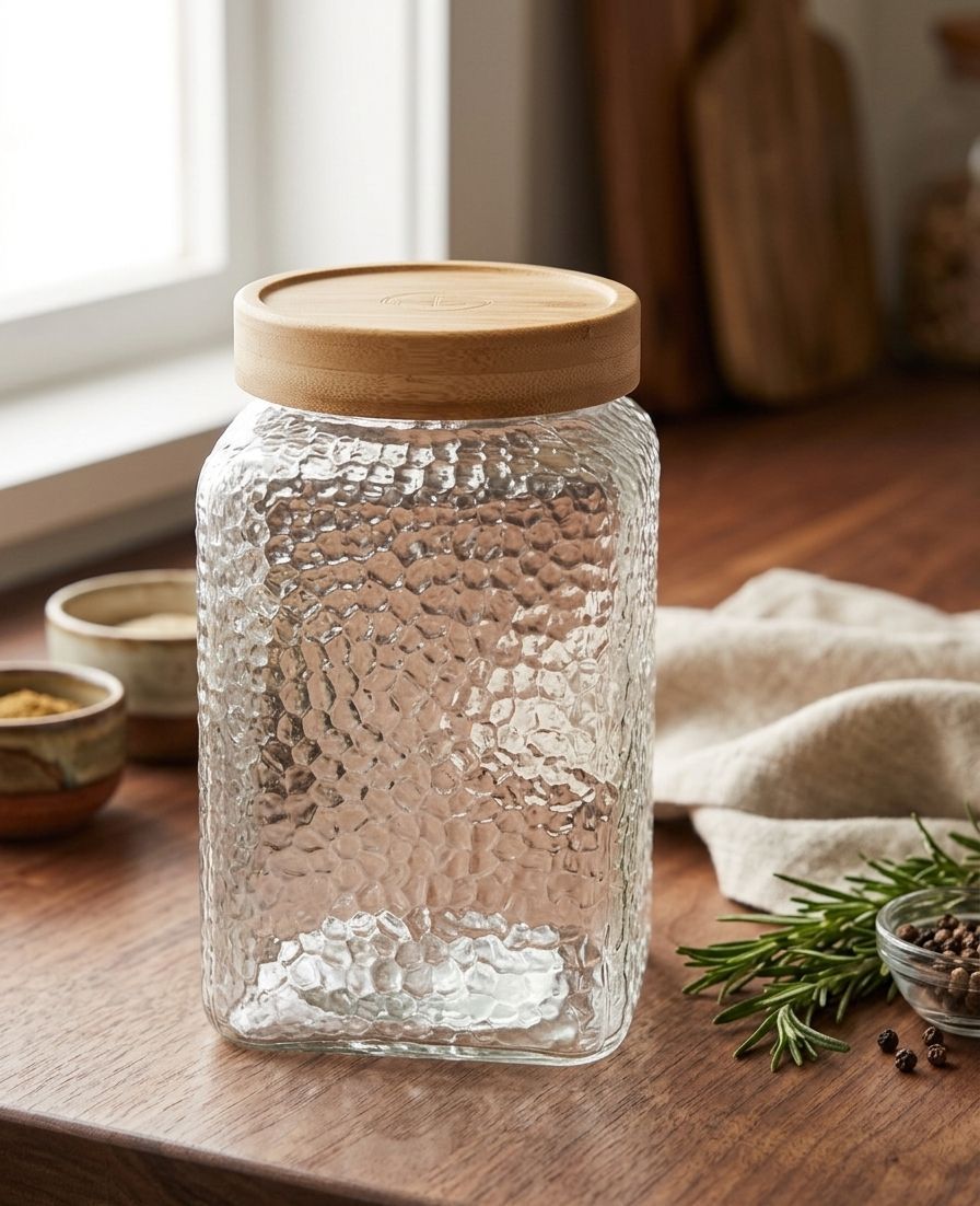 Frasco de vidrio rugoso p/ almacenamiento c/ tapa de bambú / 1.8L (C6414)