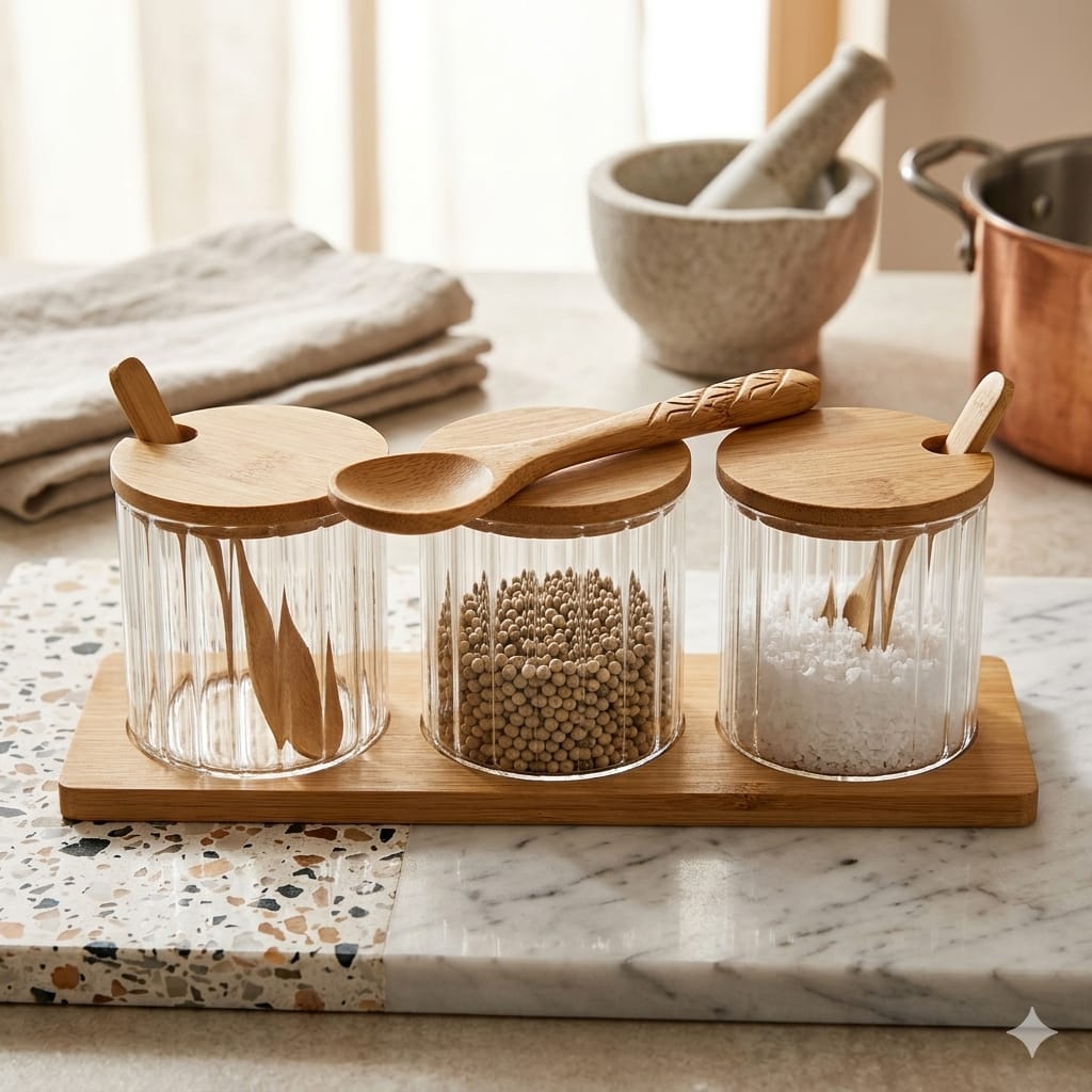 Juego de 3 condimenteros c/ base de bambú (56570)